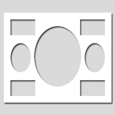 Picture mat board with more than one window is sometimes referred to as collage photo mats and all of the standard designs may be cut from any of the matting materials and colors we carry from economy grade up to the finest museum 8ply cotton rag boards. If you have your own layout we can custom cut that for a virtually unlimited number of custom options with multiple window openings.